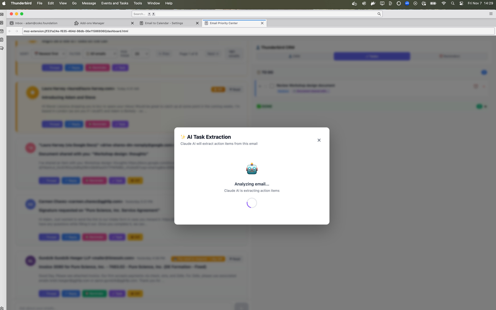 Within days, I had a comprehensive email management system running inside Thunderbird. Gmail-like UX. CRM-lite for contacts. Task management. Automatic AI sorting of emails (except those I've blocked for privacy). AI-assisted natural language search. Draft generation from prompts. Email-to-task conversion. Follow-up reminders.