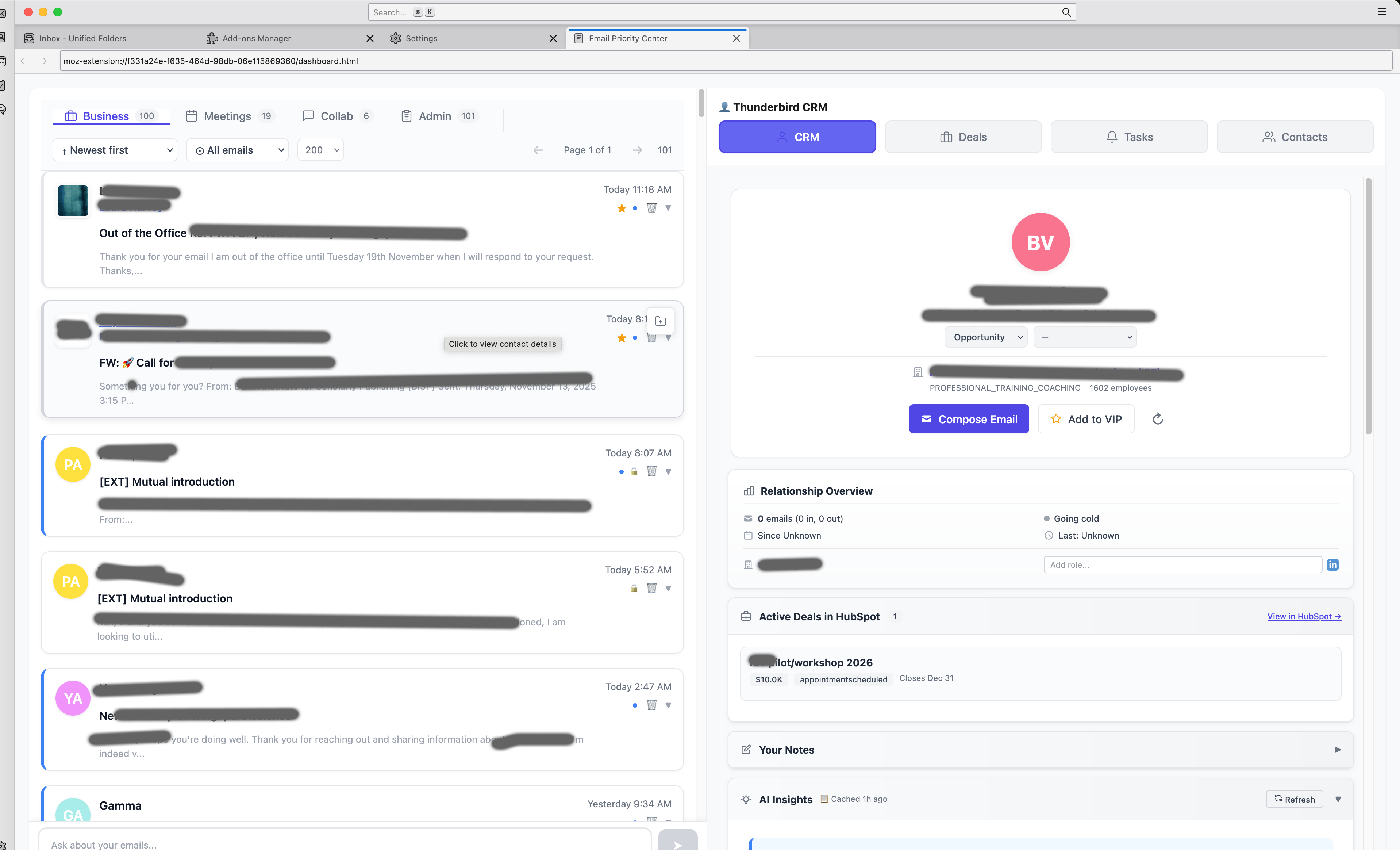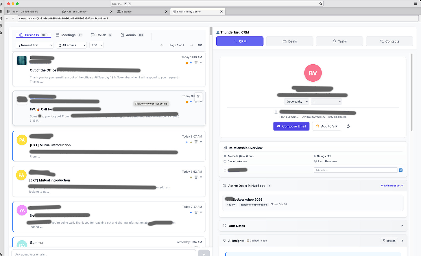 I built a complete HubSpot CRM integration. Full bidirectional sync. Contact management. Deal tracking. Task synchronization. Timeline logging. All of it. Running locally, entirely within Thunderbird, never needing to open HubSpot again.